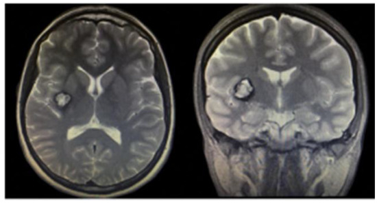 Cavernous angioma in the right insula and putamen. Axial and coronal T2 magnetic resonance imaging [37].