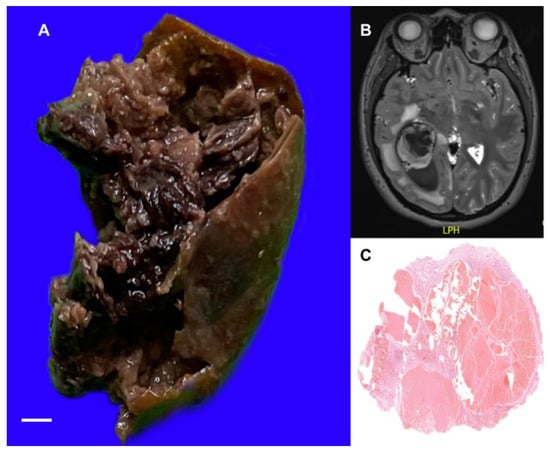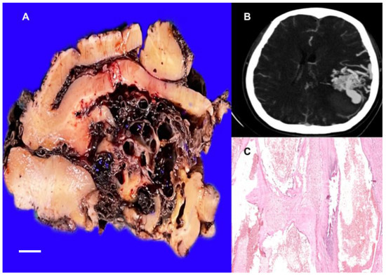 (A) Cut surface of arteriovenous malformation showing multiple vessels with variable lumens immersed in brain parenchyma. (B) Axial slice CT angiography showing a lesion composed of a vascular conglomerate that enhances the contrast medium. (C) Histological section showing vessels with variable lumens and mural thicknesses with arterialization and brain parenchyma between the vessels HE 10×. The white bar represents 1 cm.