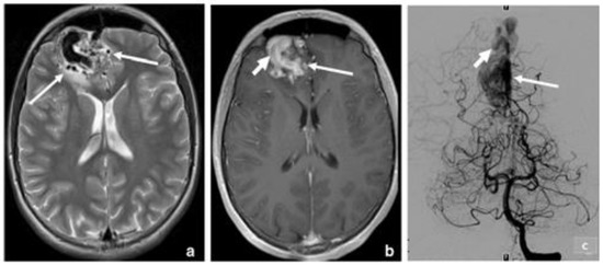 Arteriovenous malformation of the right frontal lobe: (a) T2 MRI, axial image, shows multiple hypointense flow gaps, with a slight signal anomaly in the surrounding cerebral parenchyma (arrows); (b) with contrast, it shows an early enhancement of AVMs (arrows); (c) digital subtraction angiography of the left vertebral artery’s catheterization in the coronal plane shows the AVMs nidus (long arrow) and the drainage veins with opacification (short arrow) [8].