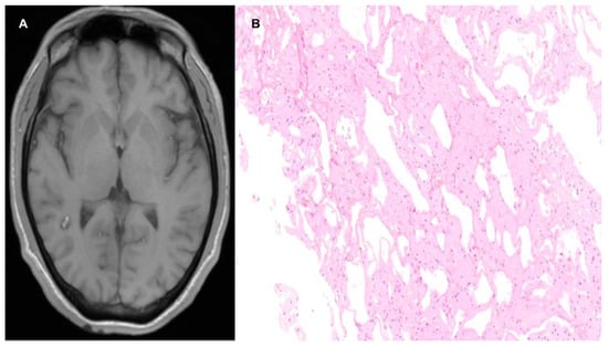 (A) Simple T1-weighted axial slice MRI showing an oval lesion in the white matter of the right superior temporal gyrus, with a hyperintense center and a hypointense halo. (B) Histologic section shows telangiectasia with small, thin-walled vessels, luminal dilation, and white matter between them.