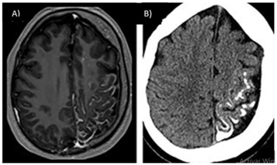 Given the wide variety of manifestations, clinical diagnosis can be difficult. However, electroencephalography studies can help in identifying SWS in newborns by observing background anomalies in the electroencephalogram, which are characterized by low voltage amplitudes and attenuation of dominant rhythms, as well as by acute waves or peak and wave discharges that are associated with clinical or subclinical seizures. Neuroimaging studies are more sensitive and specific in performing the SWS diagnosis, with MRI recommended as a first-line study in the diagnostic approach. Such studies are based on the incidence of facial angioma and leptomeningeal angiomatosis as standards for diagnosis [65,69]. The MRI protocol with a contrast medium, such as gadolinium, facilitates the detection of angiomatosis and the degree of involvement of brain structures. as a second line of study, CT is recommended to identify cerebral calcifications. The CT protocol via single photon emission identifies the decrease in blood flow in the brain area affected by leptomeningeal angiomatosis (Figure 11) [69].