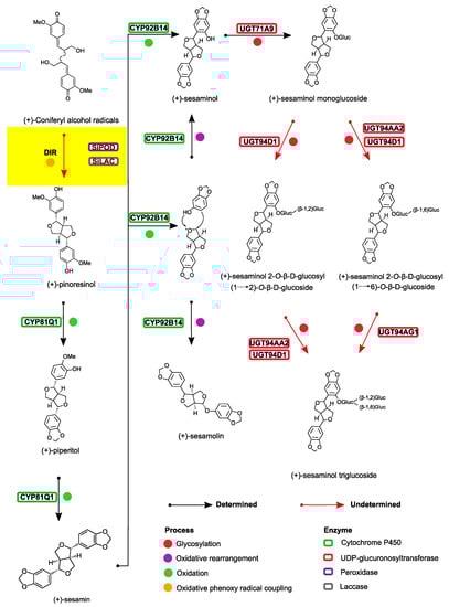 - Murata, J.; Ono, E.; Yoroizuka, S.; Toyonaga, H.; Shiraishi, A.; Mori, S.; Tera, M.; Azuma, T.; Nagano, A.J.; Nakayasu, M.; et al. Oxidative rearrangement of (+)-sesamin by CYP92B14 co-generates twin dietary lignans in sesame. Nat. Commun. 2017, 8, 2115. [Google Scholar] [CrossRef] [PubMed]