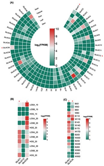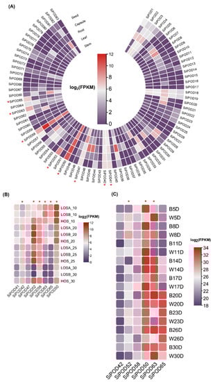 3.2. Expression Profiles of SiPOD and SiLAC Genes in Different Tissues and Candidate Genes Selection