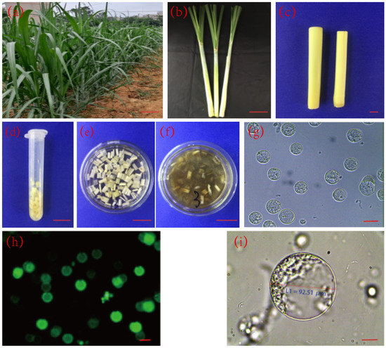 Sugarcane protoplast preparation. (a) sugarcane plant at the early elongation stage, bar = 30 cm; (b) the outer 2–3 layers of the leaf sheath were peeled off, bar = 7.5 cm; (c) the light and yellow central part of young leaves; (d) the young leaf cells 1–5 cm above the growing point were cut into sections of about 1 mm in thickness; (e) 5 mL of 13% CPW solution was added; (f) 5 mL of enzymatic digestion solution was added and enzymatic digestion was carried out for 4 h at room temperature (28 °C); (g) after enzymatic digestion sugarcane protoplasts were obtained; (h) the dark field of FDA staining of the enzymatically digested sugarcane protoplasts; (i) Enlarged protoplasts after enzymatic digestion; Note: (c–f) bar = 1.5 cm; (g–i) bar = 20 μm.