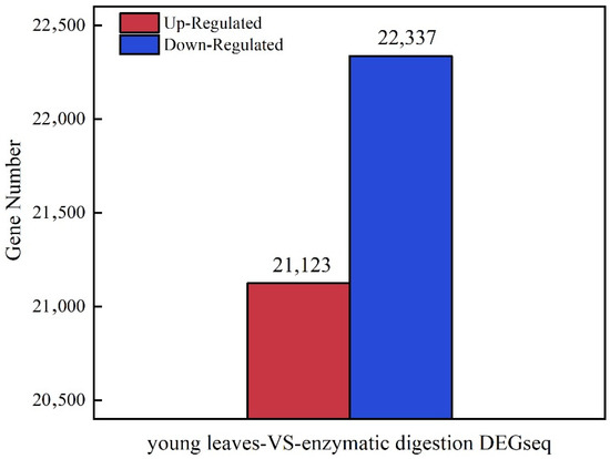 We identified 43,460 differentially expressed genes (DEGs) in protoplasts VS young leaves after enzymatic digestion with the set threshold at 0.05. A total of 43,460 genes were identified as DEGs by RNA-seq. Of them, 21,123 were up-regulated while 22,337 were down-regulated (Figure 2).