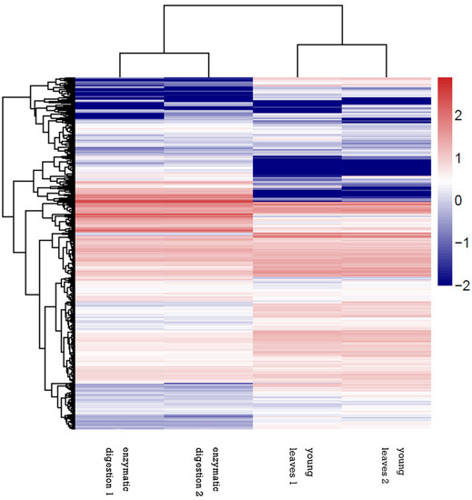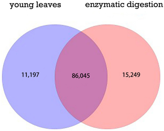 Quantitative analysis of differential genes expression in young sugarcane leaves before and after enzymatic digestion showed that 86,045 DEGs (76.49%) were common between these two assemblies, 11,197 DEGs (9.95%) unique to those in the sample before enzymatic digestion, and 15,248 DEGs (13.56%) unique to those in the sample after enzymatic digestion (Figure 3).