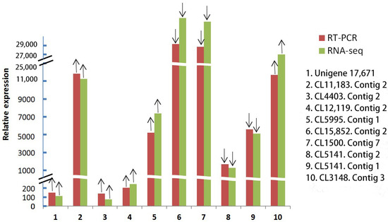 Results of relative expression of selected 10 differentially expressed genes by qRT-PCR. ↑ indicates up-regulated gene expression; ↓ indicates down-regulation of gene expression.