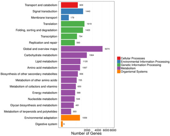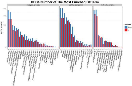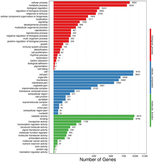 The full-length transcriptome sequencing was carried out, and a total of 26.48 Gb of data were obtained from RNA-seq using BGISEQ-500 platform. First, the sequencing joints were pruned, and then reads with unknown base N content greater than 5% and low-quality reads were removed (defined as low-quality reads with the proportion of base number less than 10 in total number of the reads greater than 20%). After clean reads were obtained in the following analysis, trinity was used for de novo assembly of clean reads, and tgicl was used for clustering de-redundancy of transcripts to obtain unigene. According to the assembly results, unigene was used, the clean reads of each sample were compared to unigene by Bowtie2 software (Version Number: Bowtie2; Creator: Ben Langmead & Steven L Salzberg; Source: College Park, MD, USA), and then the gene expression level of each sample was calculated by RSEM. According to the method of Wang et al. (2010) [46], DEGseq detection was performed, the difference multiple was more than twice and the Q-value was 0.001, screened as significantly differentially expressed genes.