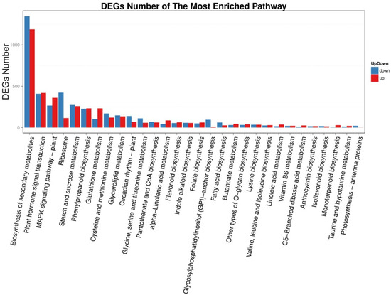 Up and down regulation of KEGG metabolic pathways of young leaves VS enzymatic digestion. The X axis represents the pathway, and the Y axis represents the number of up and down regulated differentially expressed genes (DEGs) for the corresponding pathway.