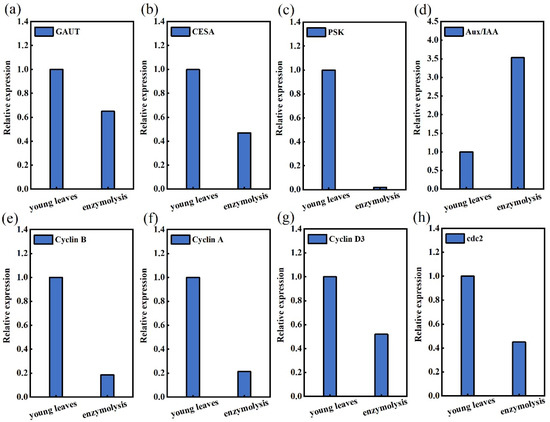 Expression of GAUT, CESA, PSK, Aux/IAA, Cycliin B, Cyclin A, Cyclin D3 and cdc2 genes before and after enzymolysis of young leaves. (a) The expression of GAUT after enzymatic digestion was only 65% of that of young leaves; (b) The expression of CESA after enzymatic digestion was only 47% of that of young leaves; (c) The expression of PSK after enzymatic digestion was only 2% of that of young leaves; (d) The expression of Aux/IAA was up-regulated by 3.53-fold in young leaves after enzymatic digestion; (e) The expression of CyclinB after enzymatic digestion was only 18.60% of that of young leaves; (f) The expression of CyclinA after enzymatic digestion was only 21.32% of that of young leaves; (g) The expression of Cyclin D3 after enzymatic digestion was only 52% of that of young leaves; (h) The expression of cdc2 after enzymatic digestion was only 45% of that of young leaves.