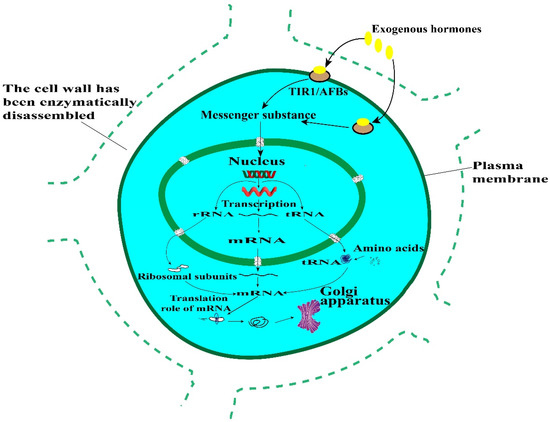 Cellulose, hemicellulose and pectin are the three main components of plant primary cell walls. Galacturonic acid transferase (Galacturonosyltransferase, GAUT) is the key enzyme catalyzing UDP-galacturonic acid to form homogalacturonan frame in pectin bio-synthesis [25,26]. Cellulose synthase (CesAs) and cellulose synthase-like (Csl) genes encode enzymes that synthesize cellulose and most hemicellulosic polysaccharides [27]. Loss of GAUT function in the synthesis of pectin and xylan in 15 wild-type Arabidopsis species affects plant cell wall production [28]. GAUTs were highly expressed in the secondary wall thickening stage during the initial stage of fiber development of island cotton, and both the initial stage of fiber development and the secondary wall thickening stage were closely related to the formation of plant cell wall. GAUT 13 and GAUT I4 are located in the Golgi apparatus and are involved in plant development processes, such as promoting the synthesis of pectin and xylan in pollen tube walls and nutrient cell walls [29]. In our study, one of the striking findings was that after enzymatic digestion of young leaves of sugarcane, the expressions of the genes encoding proteins GAUTs and CESAs were down-regulated significantly, which will affect the biosynthesis of pectin and cellulose, possibly leading to the difficulty in cell wall regeneration of protoplasts after enzymatic digestion. The regeneration and synthesis of new cell wall is the first and critical step in the regeneration of somatic cell fusion. It has been shown that exogenous hormones can regulate the synthesis of new protoplasmic components and new cell wall substances in protoplasts due to the fact that growth hormone can promote the synthesis of new nucleic acids and proteins, thus inducing cell growth. And the expression of GAUT and CESA genes are closely related to cell wall components, so in the next research work, we can try to culture sugarcane protoplasts with suitable exogenous hormones to increase the expression of GAUT, CESA, and thus promote the synthesis of new cell walls, as shown in Figure 11.