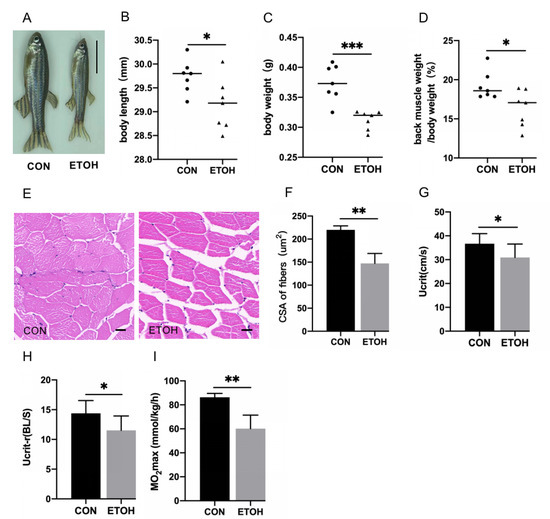 Morphology, skeletal muscle histology, and exercise capacity analysis of alcohol-induced zebrafish. (A) Comparison of appearance. Bar = 10 mm. (B) Body length (mm). (C) Body weight (g). (D) Back muscle proportion of body weight (%). (E) Hematoxylin–eosin (HE) staining. Bar = 20 µm. (F) Cross-sectional area (CSA) of muscle fibers (μm2). (G) Absolute critical swimming speed (cm/s). (H) Relative critical swimming speed (body length/second). (I) Maximal oxygen uptake (mmol/kg/h). n = 7. * p < 0.05, ** p < 0.01, *** p < 0.001.