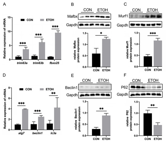 The main pathways of protein degradation are the UPS and ALS, which are involved in the degradation of more than 80% of proteins in cells [33]. The results showed that the mRNA levels of the UPS marker factors trim63a, trim63b, and fbxo25 in the alcohol exposure group were significantly increased (Figure 2A). The protein levels of Mafbx and Murf1 were significantly increased (Figure 2B,C). The ALS mRNA levels of the marker factors atg7, beclin1, and lc3a were also significantly increased in the alcohol exposure group (Figure 2D), and the protein level of Beclin1 was significantly increased (Figure 2E), while the protein levels of the autophagy substrate P62 were decreased (Figure 2F).