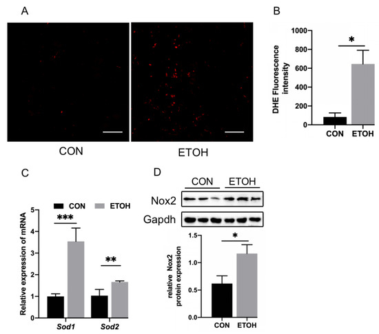 We detected reactive oxygen species (ROS) in alcohol-exposed zebrafish skeletal muscle by DHE staining. The results showed that the content of ROS in the fibers of skeletal muscle in the alcohol exposure group was significantly increased (Figure 3A), and the fluorescence intensity of ROS was also significantly increased, as determined by ImageJ analysis (Figure 3B). The mRNA levels of the antioxidant enzymes sod1 and sod2 (Figure 3C) in the alcohol exposure group were significantly increased, and the protein expression of nicotinamide adenine dinucleotide phosphate oxidase 2 (Nox2) was significantly increased (Figure 3D).