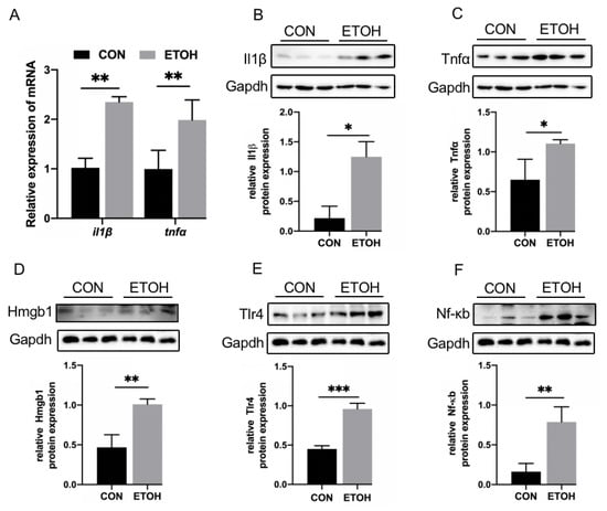 Next, we tested alcohol-exposed zebrafish skeletal muscle for inflammatory factors and HMGB1/TLR4/NF-κB signaling. Compared with those in the control group, the mRNA levels of the inflammatory factors il1β and tnfα were significantly increased in the alcohol exposure group (Figure 4A). The expression of the Il1β and Tnfα proteins was also significantly increased (Figure 4B,C). Moreover, the protein levels of Hmgb1, Tlr4, and Nf-κb were significantly upregulated (Figure 4D–F).