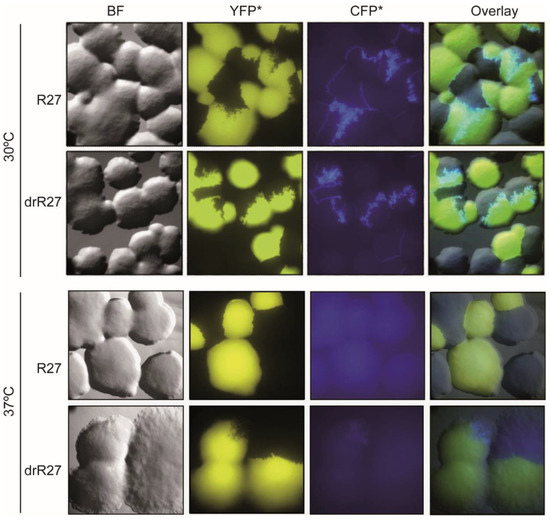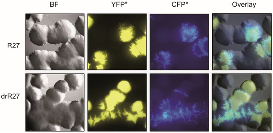 To monitor the in situ transfer of IncHI1 plasmids between E. coli cells, derivatives of R27 and drR27 plasmids carrying a cyan fluorescence reporter gene (cfp*) were generated. drR27 is a derepressed R27 variant due to a mutation in the plasmid encoded htdA gene that causes an increase on the transcription of tra genes and, consequently, a drastic increase in the conjugation frequency. In order to monitor the conjugation, the strain SAR08 carrying the pAR179Km plasmid, that express constitutively a red fluorescent protein, DsRed2.T3, was used as donor and the strain SAR20, labeled with yellow fluorescence protein (YFP*) as recipient. To efficiently discriminate between donors and transconjugants, the cfp* gene is only expressed in transconjugant cells since the donor cells carry a LacI repressor that maintain the cfp* gene in a silenced state. Conjugation on solid surfaces was tested by inoculating both donor and recipient cells on LB agar plates and incubation for 36 h at the permissive temperature for conjugation (25 °C). The bacterial populations were observed under epifluorescence microscopy (Figure 1). The epifluorescence microscope allows for the detection of the YFP* (yellow labelled, indicating recipient cells) and CFP* (blue labelled, indicating transconjugant cells) fluorophores but not the DsRed2.T3 fluorophore. However, donor colonies can be identified with the bright field image. Transconjugant cells were located throughout the contact surface between a donor and a recipient colony for both wt and derepressed plasmids (Figure 1). The drR27 is transferred at 25 °C with a frequency higher than four log-fold as compared to R27 during mating assays in liquid media [8,23]. However, apparently identical images were detected when the donor cells carried either R27 or drR27. No important differences in the thickness of the layer corresponding to transconjugant cells were detected by visual observation (Figure 1).