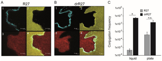 As depicted by CLSM, the amount of transconjugant cells generated during mating assays with drR27 seems to be slightly higher than for R27 plasmid. The observed difference is negligible, however, when compared with the conjugation frequencies for both plasmids in liquid culture, i.e., more than four log-fold higher for drR27 than for the R27 plasmid (Figure 2C). Conjugation frequencies for R27 and drR27 plasmids on solid media (agar plates) were also determined using the classical methodology based on plating and viable cell count after mating incubation. Consistent with the in situ monitoring experiment, the great difference in the conjugation frequencies detected in liquid drops when mating assays were performed on solid media (Figure 2C).
