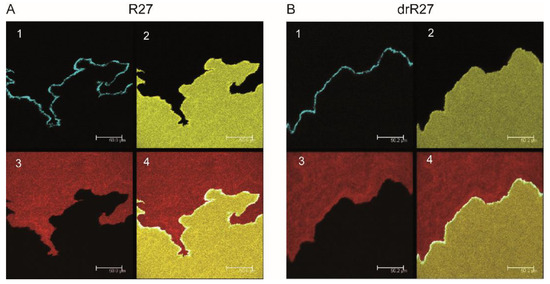 At 37 °C, the amount of transconjugants detected by epifluorescence microscopy dropped drastically (Figure 3), consistent with previous data on the thermosensitivity of R27 conjugation in liquid cultures [4,5]. In the case of the R27 plasmid conjugation, no transconjugant cells were observed at 37 °C in any assay replica. With drR27, transconjugants could be visualized, although very rarely, suggesting that the transfer of drR27 plasmid occurs at a very low frequency. The conjugation ratio and the amount of transconjugants at 37 °C were so low that CLSM did not allow for the detection of transconjugant cells with either R27 or drR27 (Figure 5).