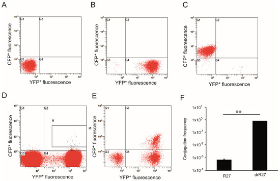Liquid cultures of the donor strain with either R27 or drR27 plasmid grown at 25 °C for 16 h were used for mating experiments. Conjugation mixtures were analyzed after 2 h mating incubation. The cell distribution for conjugation of R27-cfp* and drR27-cfp* is shown in Figure 6D,E, respectively, and the conjugation frequency was calculated as the ratio between donor and transconjugant cells (Figure 6F). The conjugation frequency of drR27 plasmid at 25 °C reaches levels of about 1, whereas when using R27 plasmid, conjugation frequency decreases more than three log-fold. These frequencies are in good agreement with those calculated by traditional antibiotic plating assays ([8] and Figure 2C). Flow cytometry is a faster method to determine frequency of plasmid conjugation. However, a weak point of this methodology is that its reliability is compromised when plasmids with very low frequency of conjugation are tested. For instance, when using the R27 plasmid, the determination of conjugation frequencies is compromised due to the very low relative amount of transconjugant cells. In the samples from R27 mating assays, the percentage of transconjugants is so low that technical background noise can importantly affect the output of transconjugant quantification.