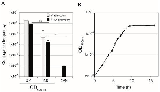 Highest frequency of conjugation was observed when donor cells were in mid-exponential phase of growth (OD600nm of 0.4). Conjugation frequencies dropped when donor cells from cultures with higher OD600nm were used. Hence, a more than 1 log-fold decrease is observed when using donor cultures entering stationary phase (OD600nm of 2.0) and at late stationary phase (16 h incubation, O/N), the conjugation frequency drops almost four log-fold log, as compared to exponentially growing donor cells. The observed increase in the conjugation frequency in logarithmic phase is in agreement with the results obtained by plating based quantification of transconjugant and donor cells at mid-exponential phase and in the entry to stationary phase (light grey bars in Figure 7, [7]).