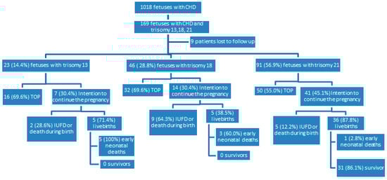 Outcome after prenatal diagnosis of trisomy 13, 18, and 21 in fetuses with congenital heart disease. CHD, congenital heart disease; TOP, termination of pregnancy; IUFD, intrauterine fetal death.
