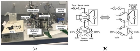The Basic system of HPR-30 (Figure 1a,b) consists of a water reservoir, a high-pressure pump (LC-10ADvp, Shimadzu, Kyoto, Japan, or PU-4285, JASCO, Tokyo, Japan), a sample loop injector (VI-11, EYELA, Tokyo, Japan), a high-pressure/temperature reactor tubing coil (H-P/T coil) with heating aluminum blocks, a high-pressure switching valve (Rheodyne 7010, IDEX Health & Science, Oak Harbor, WA, USA), a cooling bath, two pressure regulators (PU-880, Upchurch Scientific, IDEX Health & Science, Oak Harbor, WA, USA), and a sampling port, designed based on our previous studies [7,9,16]. The high-pressure switching valve was used for changing the flow path to keep the tubing reactor at high pressure and high temperature in order to adjust the residence time by isolating the H-P/T coil from the main flow path. The flow scheme with switching valve is illustrated in Figure 1a,b. The switching 6-port valve is exposed to high temperature as well as the H-P/T-coil, which results in an upper temperature limit of 150 °C. The dead volume connecting the switching valve, which is also regarded as a part of H-P/T coil, was adjusted to less than 5% for the total volume of the H-P/T coil by shortening the connecting tubing lines. The pressure was controlled by the pressure regulator at values up to 30 ± 0.3 MPa. The timing for the switching valve after the sample injection and the sampling timing after the end of reaction were determined using 0.1 M HCl solution.