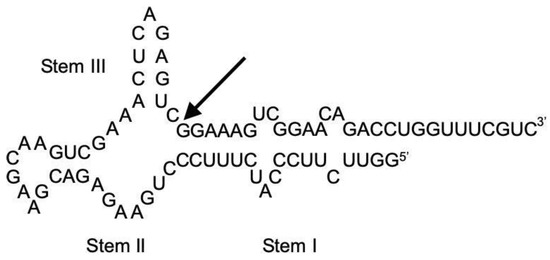 The ribozyme (whose sequence and secondary structure are shown in Figure 2) was prepared by in vitro transcription as described in our previous publication [19]. In addition, the same sequence of RNA was outsourced from FASMAC, Japan. We confirmed the purity of the RNA molecules by electrophoresis and HPLC, and there were no differences between the ribozymes prepared in our laboratory and those obtained from the company. All other reagents used for ribozyme reactions were of DNase- and RNase-free grade, and the reagents used for analysis were of analytical grade.