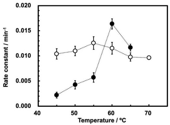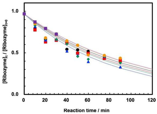 The measurements using either the ribozyme prepared by in vitro transcription in our laboratory or that prepared commercially in FASMAC did not show any difference in their cleavage behavior. According to our previous study, the self-cleavage is dominant at temperatures up to 60 °C, while partially random degradative hydrolysis of phosphodiester bonds within the ribozyme sequence occurs with increasing temperature, especially over 65 °C [19]. We confirmed that the reaction was observable up to 70 °C in batch reactions, that it still followed first-order kinetics, and that there was no notable influence of the random degradation of the ribozyme on the cleavage analysis. The first-order rate constants at temperatures of 45–70 °C are summarized in Table 1. The influence of random hydrolysis is not notable, so the determination of the first-order rate constants was based on the ratio of 79 nt among the total amount of 28 nt, 51 nt, and 79 nt as per our previous study [19]. The temperature dependence of the rate constants shows that they are maximum at 55 °C. This is consistent with our previous study [19]. In addition, this is reasonable since the cleavage rate of ASBVd was also maximum at 55 °C [15].