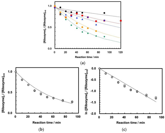 Reaction curves for self-cleavage of ASBVd(−):HHR at 30.0 MPa at 45–65 °C. [ASBVd(−):HHR] = 3.30 μg/110 μL solution. [HEPES] = 0.05 M, [MgCl2] = 0.05 M, pH = 8.0. (a) Reaction curves at 45–65 °C. Black circles: 45 °C, red squares: 50 °C, blue triangles: 55 °C, green diamonds: 60 °C, orange circles: 65 °C. (b) Duplicated measurements of reaction curves at 60 °C. (c) First-order rate plots for the duplicated measurements of reaction curves at 60 °C.