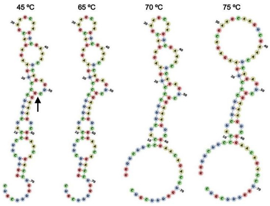 Estimated secondary structures of ASBVd(−):HHR as a function of temperature. The arrow indicates the self-cleavage site.