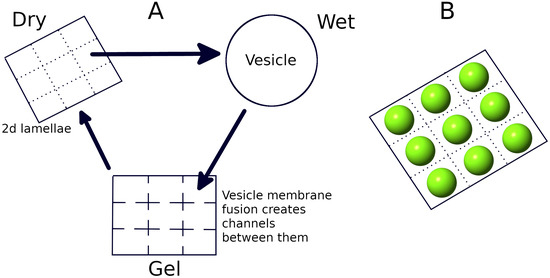 (A) Pictorial representation of the three phases that periodically occur in hot spring environments. Multilamellar structures can form on mineral surfaces from lipid molecules in the dry phase, one layer of which is represented as a 2D lattice containing sites for RNA polymerization. Each site can swell into a vesicle in the wet phase. In the gel phase, the vesicles become deposited on the 2D surface and their membranes start to fuse, creating channels between them that can allow for the long-range diffusion of large RNA strands. Subsequent to this stage, the multilamellar structure forms again in the next dry phase. (B) Three-dimensional (3D) representation of the formation of vesicles from the lamella in the wet phase.