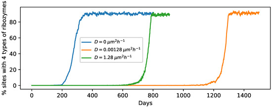 Time evolution plots (1 trial each) showing the percentage of sites containing all 4 types of ribozymes for (blue); (orange) and (green) starting from 1 circular ssRNA per site initially.