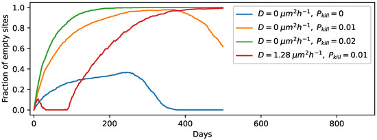 Time evolution of the fraction of empty sites for with no protocell degradation in the wet phase; when protocells degrade with probability ; when protocells degrade with probability ; when protocells degrade with probability .