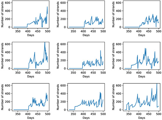 We also plot the total number of strands vs. time of a random site and its eight nearest neighbors for the case of D = 0 and (Figure 4). As evident from the figure, during this time period, the total number of strands of a site goes to zero six times (counting across all the nine sites) as a result of the protocell degradation process. The large fluctuations in the number of RNA strands observed in the plots is a consequence of the protocell division process when a parent protocell divides upon reaching the threshold volume, and its strands are divided roughly equally between its two daughter protocells. For example, the central site (the sub-plot in row 2, column 2 of Figure 4), which does not contain any strands initially, acquires strands by the protocell division process from either the protocell at the bottom center panel (row 3, column 2 of Figure 4) or the protocell at the bottom right panel (row 3, column 3 of Figure 4), both of which divide in the previous wet phase. Tracking the temporal variation in a specific ribozyme (such as the cyclase) across these nine sites reveals features that are not evident from Figure 4. Not surprisingly, the total number of cyclase goes to zero more often than the total number of strands. However, this often happens as a consequence of the asymmetric distribution of RNA strands across the two daughter protocells following a protocell division event. To highlight this fact, Figure 5 shows the temporal variation in the number of cyclase for three of the nine sites depicted in Figure 4. In Figure 5B (central site), when the cyclase number goes to zero from six just after days, the number of cyclase at a neighboring site (Figure 5C) becomes six, indicating that one of the daughter protocells of the central site that acquired all the cyclases after division has occupied a neighboring site, while the other daughter cell that does not contain any cyclase has replaced the parent protocell at the central site.