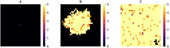 Expansion of protocell population from only one site containing 5 circular ssRNA templates initially. (A) Initial stage; (B) intermediate stage (on the 300th day) and (C) when the percentage of sites with all 4 ribozymes becomes 90%. Color values: Black: no strands, Purple: contains only non-enzymatic strands, Magenta: contains 1 type of ribozyme, Orange: contains 2 types of ribozymes, Dark Yellow: contains 3 types of ribozymes, Light Yellow: contains 4 types of ribozymes.
