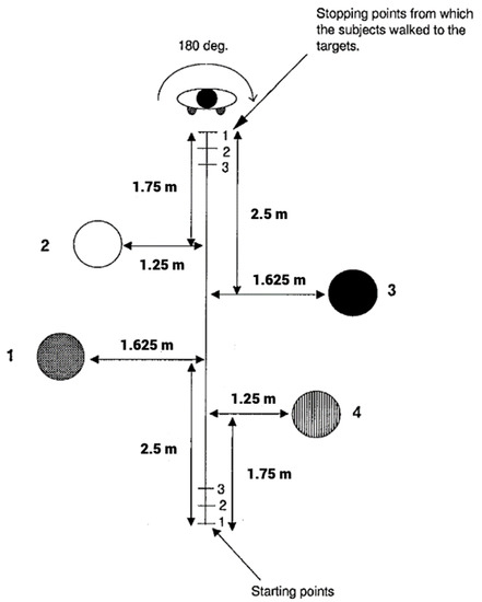 - Dynamic (updating) condition: The participant is walked to a starting point and is first allowed to memorize locations of all four targets from that starting point. He/she is then guided (with open eyes) by the experimenter to a respective stopping point in a straight line, using tactile (examiners held participants’ shoulders) and verbal instructions (“start/stop” walking). The movement velocity is kept as constant as possible. After reaching the stopping point the participant is blindfolded and is then turned by 180 degrees to face the starting point. Next the experimenter instructs the participant to which target he/she should walk by naming its color. After the participant has walked to the target, his/her position is marked on the floor for assessment of errors in distance (centimeters) and angle (degrees). Still blindfolded, the participant is then guided back to the next starting point for the succeeding trial. The participants were instructed to memorize the locations of circular objects in relation to their own body (egocentric).