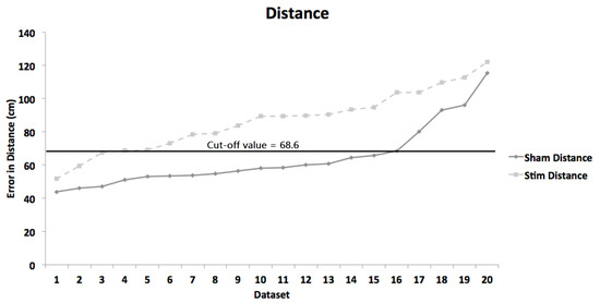 ROC curve is very informative method of establishing the sensitivity and specificity values of any test—to establish a cut-off value, or the value below which all of the stimulated participants’ values will be located, we plotted values for each participant in our study (sorted from lowest to highest error on sham and stim conditions), for both conditions (Figure 4). The cut-off value was then established by selecting the value at which the classification of participants in the two conditions was optimal (as calculated by ROC-curve in Figure 5). As displayed, the optimal established value was 68.6 cm. At this cut-off, 17 of 20 (85%) performances of stimulated participants were above the respective threshold, whereas only 4 of 20 (80%) performances of sham participants remained above this threshold. From these data, it appears that the error in distance has a good potential in differentiating between stimulated and sham conditions.