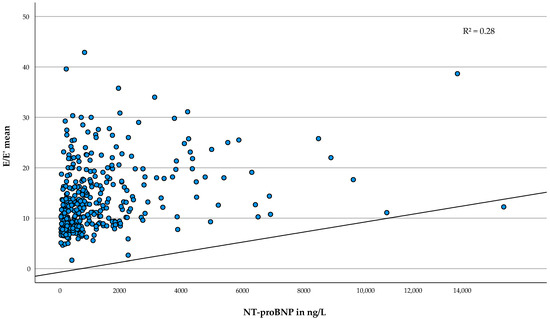 Association of serum NT-proBNP with E/E′ mean. Scatterplot of E/E′ mean and NT-proBNP in ng/L. The regression line is adjusted according to the multivariable model. Abbreviations: E = peak early transmitral filling velocity, E′ = early mitral annulus velocity, NT-proBNP = N-terminal prohormone of the brain natriuretic peptide, R2 = adjusted coefficient of determination.