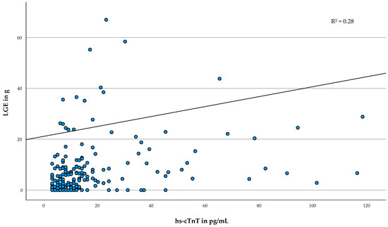 Association of serum hs-cTnT with the amount of LGE. Scatterplot of LGE size in g and hs-cTnT in pg/mL. The regression line is adjusted according to the multivariable model. Abbreviations: hs-cTnT = high sensitivity cardiac troponin T, LGE = late gadolinium enhancement, R2 = adjusted coefficient of determination.