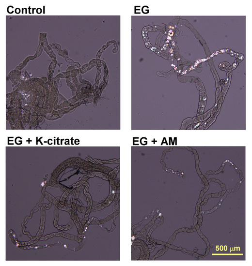 Effects of K-citrate (2%) and AM (16 mg/mL) on EG-induced crystal deposition in the Malpighian tubules of Drosophila. The images show representative polarized microscopy for the Drosophila with 0.5% EG-induced crystal formation in Malpighian tubules. Scale bar = 500 μm.