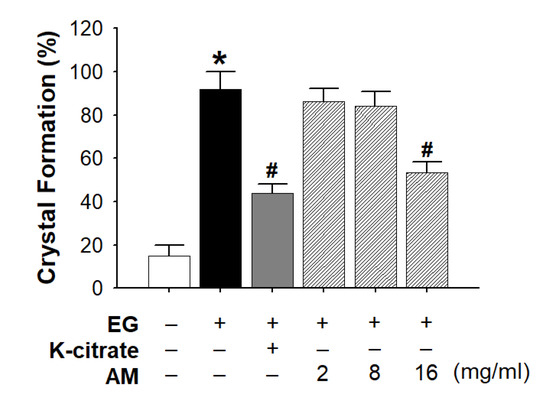 Rates of CaOx crystal formation in the in vivo study. Crystal formation in 0.5% EG, 2% K-citrate, and 2, 8, and 16 mg/mL AM-treated Drosophila (n ≅ 200 for each group; three independent experiments were performed in each group). Data are expressed as mean ± S.D. * p < 0.05, compared to the control. # p < 0.05, compared to the 0.5% EG-treated group.