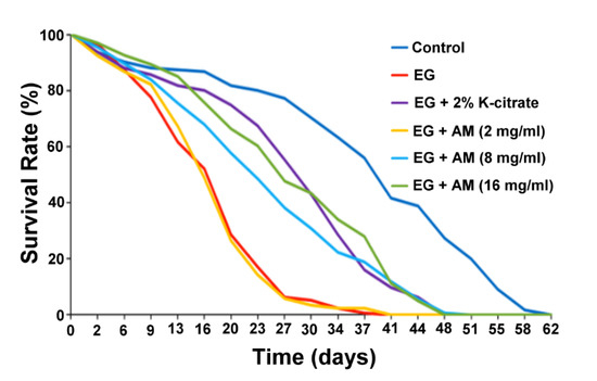To test whether the effects of AM were associated with a decreased mortality rate under treatment with the lithogenic agent EG, the lifespan of Drosophila was measured after the flies’ food was supplemented with K-citrate and various concentrations of AM (Table 2). Figure 3 shows the survival survey results of each group. EG has a toxic effect on the lifespan of Drosophila, with the shortest mean survival time. The K-citrate and AM (8 and 16 mg/mL, respectively) groups had a protective effect with longer mean survival days than the EG group (Figure 4).