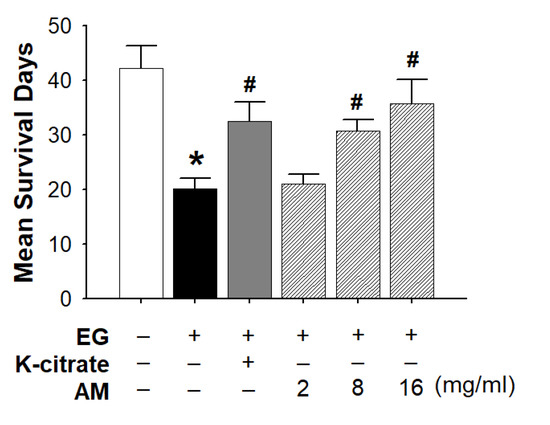 Effects of K-citrate and AM extract on lifespan. Effect of EG, EG + K-citrate, and EG + 2, 8, and 16 mg/mL AM on lifespan of Drosophila (n ≅ 200 for each group; three independent experiments were performed in each group). Data are expressed as mean ± S.D. * p < 0.05 compared to the control; # p < 0.05 compared to the 0.5% EG-treated group.