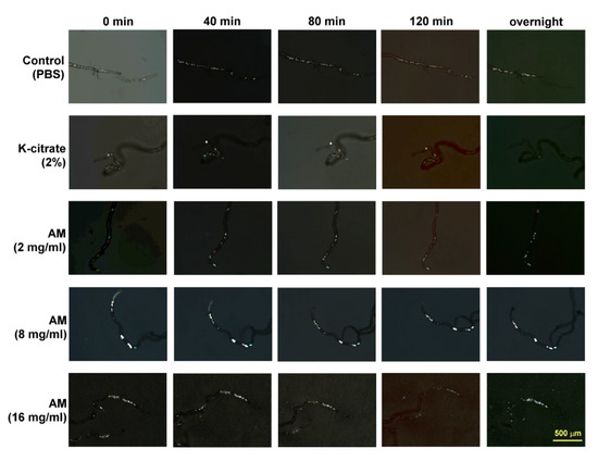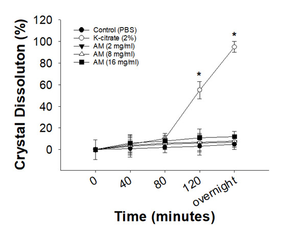 To explore the mechanism through which AM inhibits CaOx crystal formation, we examined the dissolution of CaOx crystals in Malpighian tubules ex vivo. The rate of dissolution in each group was calculated at different times. K-citrate directly dissolved the CaOx crystals in the Malpighian tubules ex vivo in a time-dependent manner. During the observation period, no CaOx crystals were excreted from the Malpighian tubule. Almost 100% of the CaOx crystals were dissolved in a 2% K-citrate solution after overnight (~16 h) treatment. In contrast, PBS and AM extracts had no effect on the dissolution of CaOx crystals preformed in the Malpighian tubule of Drosophila (Figure 5 and Figure 6).