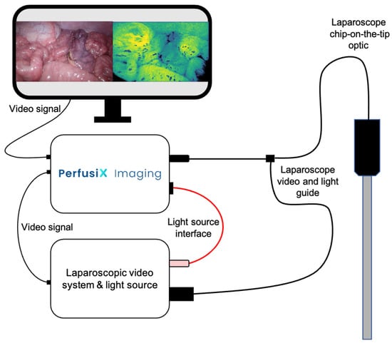 In recent years, the use of intraoperative image-guided surgery techniques has become increasingly popular as a tool used to avoid excessive vascular damage. Several techniques, such as indocyanine green near-infrared fluorescence imaging (ICG-NIRF), have been developed to improve intraoperative perfusion assessment, as well as to navigate intestinal resections. Compared with the traditional visual inspection for subjective signs of bowel viability (e.g., mucosal and serosal color, pulsatile bleeding from marginal arteries, bowel peristalsis), these techniques have the potential to be a transformative tool in the surgical field [5,6,7]. Despite much research and development, fluorescence imaging is still facing fundamental challenges that diminish its potential to become the ideal bowel viability testing technique. Albeit effective, this imaging method poses several inconveniences linked to the needed dye. The use of dyes limits both the length of real-time imaging and the repeatability of the assessment [8,9]. PerfusiX-Imaging (LIMIS Development BV, Leeuwarden, The Netherlands) is a dye-free method that could simplify, and thus speed up, intraoperative perfusion assessment. Dye-free imaging means there is no interruption of the surgical workflow due to both dye injection and to instantaneous imaging when deemed necessary. There is no wash-out effect, resulting in continuous and repeated perfusion measurements. Furthermore, no change is required regarding the surgeons’ tools, as the system is designed to be compatible as an add-on to laparoscopic imaging systems.