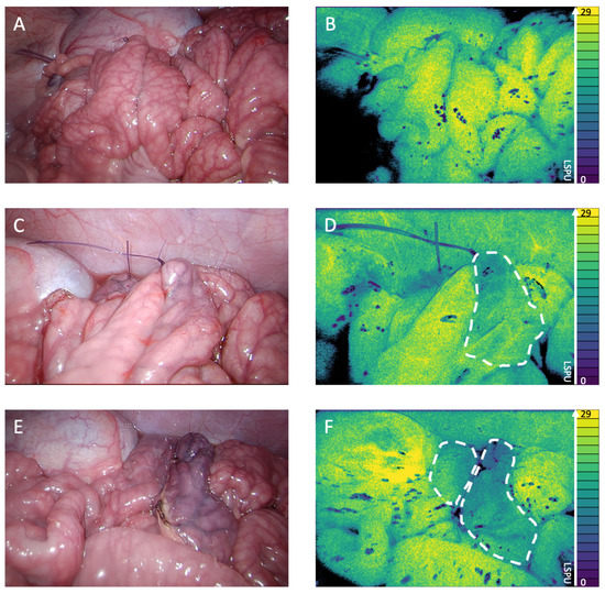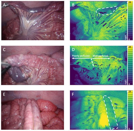 Figure 3 shows the 2D perfusion images displayed in Viridis false colors [13]. The LSCI perfusion images displayed clear demarcation lines between well perfused and poorly perfused tissue in real time, which correspond to the visual tissue discoloration. Figure 3A (conventional white light) and Figure 3B (LSCI perfusion image) display the well-well perfused anastomotic segment. The well-poor perfused anastomotic segment can be seen in Figure 3C (white light) and Figure 3D (perfusion image), with the ischemic area, as indicated by the 2D perfusion map, highlighted in Figure 3D. The right side of the anastomosis is clearly less perfused than the left side. The poor-poor perfused anastomosis segment is found in Figure 3E (white light) and Figure 3F (perfusion image); both segments showed ischemia, which is more evident on the right part of the anastomosis.
