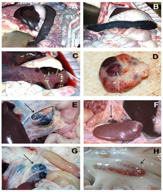 Acute ASF post-mortem examination [7]. (A) Severe hemorrhagic splenomegaly observed at the opening of the abdominal cavity of an animal with acute ASF. The liver is severely congested. (B) Very large, dark-colored spleen with rounded edges (hemorrhagic splenomegaly), occupying a large volume of the abdominal cavity in acute ASF. (C) Multiple areas of partial hemorrhagic splenomegaly in the spleen from an animal with subacute ASF. (D) Multifocal hemorrhages in a lymph node with a marbled appearance in acute ASF. (E) Severe hemorrhagic lymphadenopathy in the gastrohepatic lymph node (arrow) in acute ASF. (F) Severe hemorrhagic lymphadenopathy in the renal lymph node (arrow) in acute ASF. (G) Severe hemorrhagic lymphadenopathy in the ileocecal lymph node (arrow) in acute ASF. (H) Moderate hemorrhagic lymphadenopathy in the mesenteric lymph node (arrow) in acute ASF.