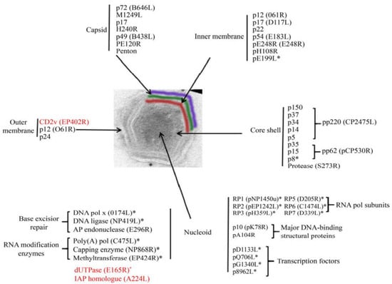 ASFV protein [49]. The distribution of proteins marked with an asterisk (*) was inferred from the predicted or known roles; the genes marked in red are nonessential genes. (adapted with permission from Alejo et al. [49]).