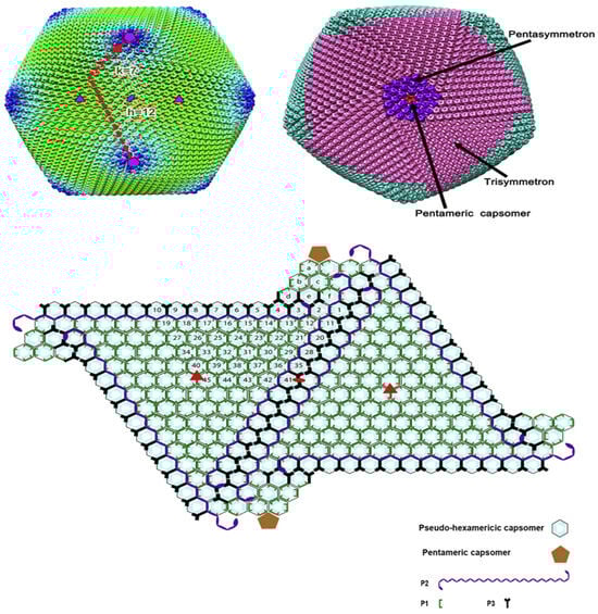 Structure of African swine fever virus (ASFV) capsid icosahedron with average cryo-EM reconstruction. The virus capsid is colored according to the radial distance from the center of the virus. The T numbers, including h and k vectors, are indicated. Three same speed and five same speed are colored in pink and purple, respectively. Graphical organization of both capsomer and small capsid protein are observed from inside of the virus shell. The capsomers of pseudo-hexamers are lining. Each cyan dot in the hexagon represents a p72 subunit. Icosahedron (three times) and the 2-fold axis are shown as a solid red triangle and oval, respectively. Pentose protein and minors’ capsid proteins have different shapes, and as shown in the picture, their colors also differ [55].
