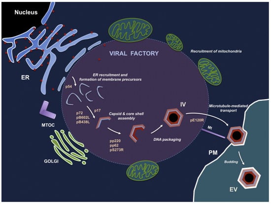 The process of ASFV generation. ASFV morphogenesis occurs in the perinuclear virus factory near the Golgi complex and the microtubule organization center. The first sign of ASFV assembly is the formation of a viral membrane precursor from the endoplasmic reticulum pool. After the capsid is gradually assembled, this viral membrane precursor becomes the polyhedral intermediate. Along with the formation of the capsid, the virus core is assembled under the inner envelope of the virus. The mature virus factory inside the cell is then transferred to the cell surface and leaves the host cell by budding from the plasma membrane. Abbreviations: ER, endoplasmic reticulum; MTOC, microtubule organizing center; PM, plasma membrane; IV, intracellular virus; EV, extracellular virus [47]. (adapted with permission from Andres and Salas [47]).